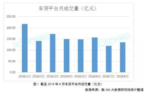 根据融360网贷评级组重点监测车贷数据显示,2018 年 8月车贷平台成交量为 134.78亿,较7月份增长13%。8月整个网贷行业成交量为920.41亿元,其中车贷成交量占比为14.64%。监测数据显示,8月网贷平台成交量较上一个月环比下降 13.56%,在行业成交量依旧下降的情况下,车贷成交量不降反升。