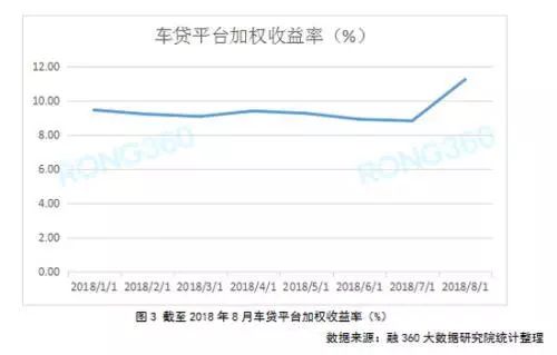 数据显示,2018年8月份车贷平台加权收益率为11.22%,高于行业平均加权收益率10.36%。从图3可以看出车贷平台加权收益率在今年6月之前较为稳定,维持在9%左右,7月爆雷潮之后,平台为吸引出借人并缓解短期资金流压力,加息力度提升,因此8月加权收益率较过去上涨明显。