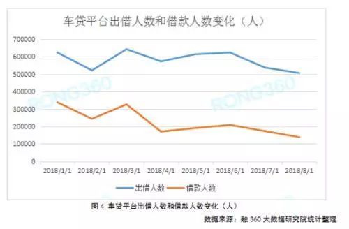 根据融360网贷评级组重点监测车贷数据显示,2018 年 8月车贷平台成交量为 134.78亿,较7月份增长13%。8月整个网贷行业成交量为920.41亿元,其中车贷成交量占比为14.64%。监测数据显示,8月网贷平台成交量较上一个月环比下降 13.56%,在行业成交量依旧下降的情况下,车贷成交量不降反升。截至2018年8月,车贷行业出借人、借款人数量分别为50.65万人、13.89万人,环比分别下降5.92%、19.96%。可见,整个行业的信心在“暴雷潮”中也的确受到了较大的影响。不过,虽然车贷行业出借人数和借款人数仍然出现下滑,但下降速度低于网贷行业整体水平。