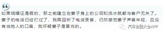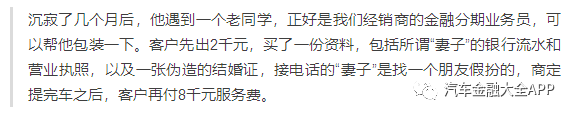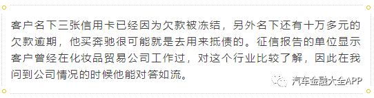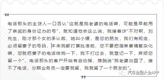 消费信贷领域,从来不乏贷款中介协助客户作假的案例,汽车金融领域也不例外。 本次案例的主人公就是一位包装“近乎完美”的客户。 从资料上看,这是一位优质客户,唯一令我起疑的是,这样一位私营业主,居然是征信白户,35年里从未办过信用卡和贷款。 我照例开始了电话回访,客户对公司经营比较了解,对于征信白户,他辩解称自己不喜欢借钱,也从未办过信用卡,妻子名下倒是有一些贷款,家里钱也是妻子在管,所以打了妻子的流水。可是我并没有权限查妻子的征信记录进行核实。 于是我拨通了妻子的电话,电话那头的女性声音略显年轻,接通后推说自己正在开会,很忙,让我快点说。在我简单核对了公司名称和月供后,她便匆匆挂断。再看妻子的流水,进出账金额都很大,而且经核实,流水是真实的。 到这里,规定要走的流程我都做完了,唯一的疑点,主贷人征信白户,他的解释倒也说得通,可面对这样一位征信白户的客户,而且第三方风控系统显示中度风险,我还是不太放心,于是打算再看一遍资料。营业执照,网上可以查到。银行流水,结息正常,卡号与姓名一致。结婚证我就一扫而过了…… 等一下,恰恰是最容易被忽略的结婚证,我再一看感觉不太对劲,仔细看两人的合照,有PS的痕迹,而且结婚时间是七八年前,但上面的钢印却是崭新的! 我一下精神了起来,就像一个猎人,发现了猎物的踪迹,但仅凭结婚证上的瑕疵,仍不足以认定结婚证是假的,我还需要更有力的证据。 尽管我们可以查手机号是否实名制,但仅限于主贷人,妻子没有签授权书,我查不了妻子的任何资料。 为了证实我的怀疑,我试着在微信上添加妻子手机号为好友,对方头像果然是一个年轻女生,还是个微商,叫小媛,与结婚证上根本不是同一个人,终于抓到狐狸尾巴了! 接下来,就是回过头来“诈”一下主贷人了,接话接通后,我上来先夸奖客户事业有成,资质不错,本次车贷没啥问题了,让他放松警惕,我说道“刘先生,刚才看了您的资料,公司开了五年多,资质还是非常不错的,这次贷款基本没啥问题了哈。但是呢,刚才与您太太通了电话,她的手机号实名制并不是您太太的名字啊”。 说到这里,我本可以用虚假资料的理由拒绝这一单了,但想到如果到时候他再换一个电话号码,重新申请,那时他准备得更充分,我们想要核实就更难了,我必须抓到更有力的证据,让他无法翻身。 于是我问他要公司员工的号码,他不肯给,说不想让员工知道自己贷款买车,我问他有没有兄弟姐妹,再留一个亲属的电话做紧急联系人。他说有个弟弟,马上报了一个弟弟的号码,并说他外出打工多年,弟弟并不知道自己的具体工作。 此时结合前面两个电话,我分析客户的公司和所谓的妻子是假的,但弟弟的电话应该是真的,和弟弟电话回访的重点主要集中在哥哥的婚姻,有没有涉及法院案件,以及有没有可能是双重身份(即一个人有两个身份证号)。 我马上把该情况上报,经过当地同事的跟进,之后的反馈果然不出我的所料。客户负债累累,他托了派出所的关系改了自己的名字,这样一来,他就变成了征信白户。于是他开始申请信用卡和贷款,没想到都被拒了。 经销商的分期专员对我们的风控手段有所了解,知道我们没法查妻子的信息,所以为客户量身包装了这样一个身份,企图蒙混过关。 而很遗憾,我们能做的只能发现骗子并拒绝,并没有其他手段去制裁他们,或许他们换一个汽车公司或者贷款平台,就能成功。一个普通人在他们的包装下,变身企业高管,私营业主……一单普通车贷申请,业务员通常只能拿几百元佣金,而包装一下客户,却可以问客户收上千的服务费。而即使申请失败,业务员也可以全身而退。 正是因为犯罪成本低廉,所以才会有源源不断的骗子来与我们斗智斗勇。