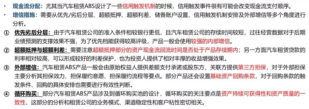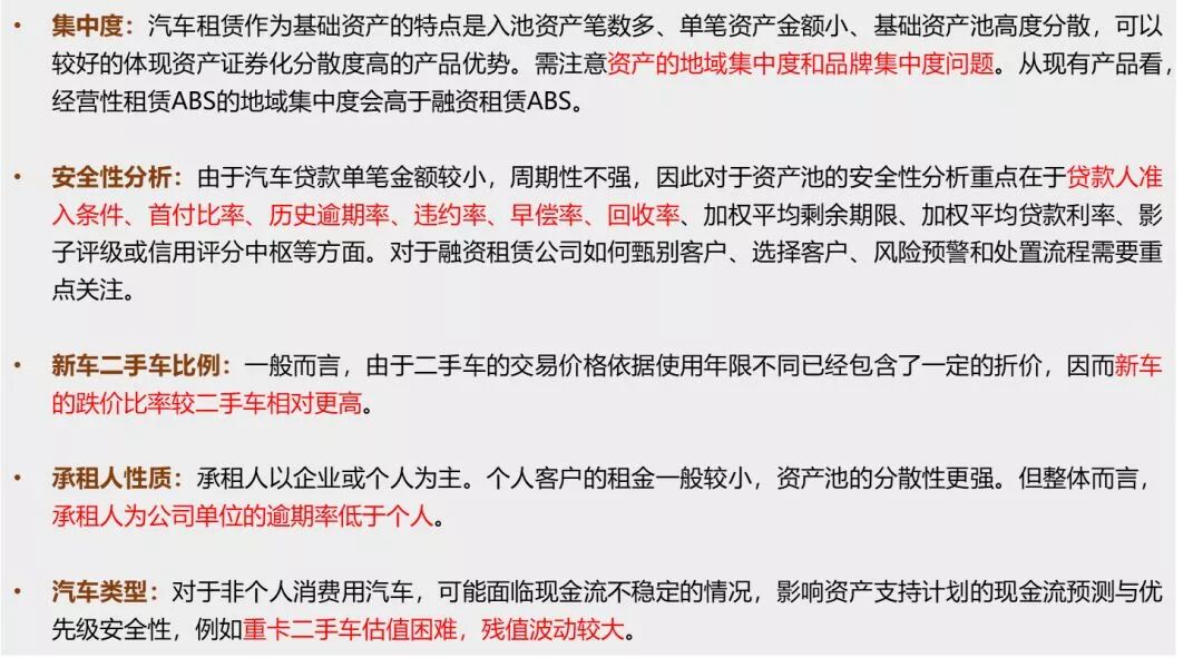 1.1 业务模式 从业务模式来看,汽车融资租赁中的承租人以取得汽车所有权为目的,经营者是以租赁的形式实现汽车所有权的转移。 资料来源:广发资管 从市场参与者的情况来看,主要分为以下四类,值得关注的是厂商系和经销商系的融资租赁公司,它们在销售渠道、二手车协同处理等方面具备优势。独立系的融资租赁公司业务模式比较灵活,比如狮桥在产业链进行全面布局,大力发展物流业务。 资料来源:《汽车租赁证券化:汽车贷款呈现新模式》 1.2 汽车融资租赁种类 目前汽车融资租赁主要分为以下三种: (1)新车融资租赁,是以租代购、分期付款的一种购车方式,租赁期限一般以24-36个月为主,还款方式以按月等额本息或等额本金为主,可以带来稳定的现金流入,厂商系租赁公司一般通过和经销商的深度绑定建立获客渠道来开展这种租赁模式; (2)二手车融资租赁,租赁期限相对新车融资租赁较短,部分类似汽车抵押短期借款,资金用于小微企业及个体工商户的资金周转或个人消费等用途,此种融资租赁的开展需要强大的流量资源,租赁公司一般需要与互联网平台绑定实现这种租赁模式; (3)对经销商的融资租赁,也就是库存融资(融资租赁公司、经销商、厂家三方),主要针对经销商从汽车厂商批量购车时面临的资金紧缺问题,汽车销售一般能实现较快的资金回笼,因此租赁期限很短,且相比其他汽车融资租赁资产而言,车辆未经使用且集中储存,保值性更好、更易于监控,能有效降低违约后的损失,但这种租赁模式对租赁公司提出了更高的资金和风控要求,目前只有大型汽车厂商及服务商才有条件开展这种租赁模式。 1.3 业务优势 相比传统金融机构,融资租赁行业具备天然提供汽车金融服务的优势: 一是融资租赁公司作为传统金融的补充板块,可以降低准入门槛,并和汽车经销商联合服务,掌握汽车消费前端市场,且面向于更全面的汽车品牌市场; 二是融资租赁的产品灵活度高,放款时间短、还款方式灵活,适合贷款时间紧张的客户; 三是通过融资租赁业务实现汽车所有权的转移,有助于发生不良后的资产处置变现流程,法律风险小、成本低。 四是融资租赁可以将购车的全部费用打包,包括保险、税费都可以进行融资。租赁公司为单位客户的租金开具的增值税发票,既可以作为企业进项税额抵扣,也可以作为企业成本费用入账的依据,从而帮助客户合理避税。 1.4 发展趋势 (1)闭环 根据易鑫等主流模式来看,打造完备的交易闭环,提高整体议价能力是非常有优势的。汽车金融和其增值服务的盈利,主要是基于流量转化和交易增长。通过借鉴易鑫模式,增加平台导流,增加二手车业务、与京东腾讯等合作导流、增加下游门店建设与广告导流和融资渠道多元化,驱动业务量快速上升,可以作为未来拥有一定实力后的发展思路。 (2)轻资产到重资产模式 渠道商分销加自营门店导流是比较成功的模式,此模式弥补了自营门店前期投入巨大但市场导流不明显的弊端。易鑫的分销店如此众多并为导流提供强有力支持主要是通过车商加盟成易鑫加盟店和后期易鑫自建门店的方式实现的。如果单纯依靠门店自建,则会形成投入高且c端导流不一定明显情况。目前易鑫通过车商打开C端市场情况下,正逐步增加自营门店业务,争取把车商分销的利润吃掉。 (3)数据系统和风控系统 依托京东、腾讯、百度等平台的系统支持,可以主动勾画出消费者行为和偏好倾向、财务状况,此种方式更加灵活可预测。加快建立优良的风控模型,更加高效的掌握运用数据系统。使得所有风控措施成为一个完整的闭环模型,提高效率和准确性。 (4)融资多元化 通过ABS、信托发行、小贷牌照、母公司注资和具有额外赋能点的战略投资者加入,可以增加资本体量降低融资成本。易鑫通过发行大量ABS和结合其他融资渠道方式,最终降低融资成本在4%-5%区间;神州车闪贷在全国启动渠道合作分销计划,吸引众多小贷公司等有放款需求机构的加入。 (5)增加产品种类,完善购车服务 增加产品种类,车型选择至少达到百款以上,增强与竞争对手的可比性。同时每款车设计多种购车方案,定期采用多种促销方案(例如0首付等),吸引用户。尽快进行App更新,实现线上全流程购车体验,同时客服人员对潜在客户,留资客户给予最快的高素质的服务响应。 (6)拓展资源,注意弊端 目前部分公司的产品和车商政策对车商较为偏倚,拉高了产品价格,能够吸引车商,产生抢夺市场的效果,基于此,应当加大线下渠道的快速拓展和ABS等低成本资金的补充。但也要注意当前的这种差异化策略可能限制长期发展,存在积重难返的弊端。 2、汽车租赁ABS发行驱动解析 (1)融资需求旺盛 我国汽车租赁公司主要以股权融资和银行贷款为主,融资渠道较为单一,有明显的局限性。股权融资可为汽车租赁公司带来较好治理结构及管理经验,但会稀释创始人及管理层原有股份。而在银行贷款过程中,除非有来自股东的强担保或不动产抵押,租赁公司需协助银行对所融资车辆逐笔进行抵押登记,手续繁琐。上述两种融资方式都面临着一些弊端,并不能完全满足汽车租赁公司的融资需求。另外融资租赁企业受到净资产10倍杠杆的局限(2013年9月18日,商务部印发《融资租赁企业监督管理办法》第二十二条规定:融资租赁企业的风险资产不得超过净资产总额的10倍)。资产支持证券化为汽车