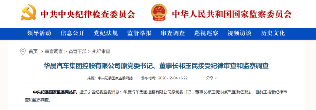 中央纪委国家监委网站12月4日消息,据辽宁省纪委监委消息:华晨汽车集团控股有限公司原党委书记、董事长祁玉民涉嫌严重违纪违法,目前正接受纪律审查和监察调查。